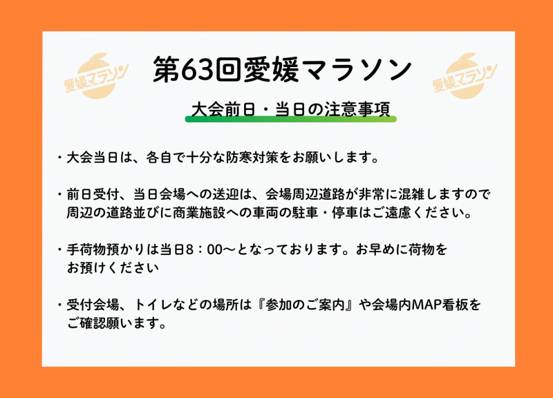 大会当日は、各自で十分な防寒対策をお願いします。 前日受付および当日の会場への送迎に伴い、会場周辺道路は非常に混雑します。 周辺道路ならびに商業施設への車両の駐車・停車はご遠慮ください。 手荷物預かりは、当日 8:00~ となっております。 混雑を避けるため、お早めに荷物をお預けください。 受付会場やトイレ等の場所については、 「参加のご案内」および会場内MAP看板をご確認ください。