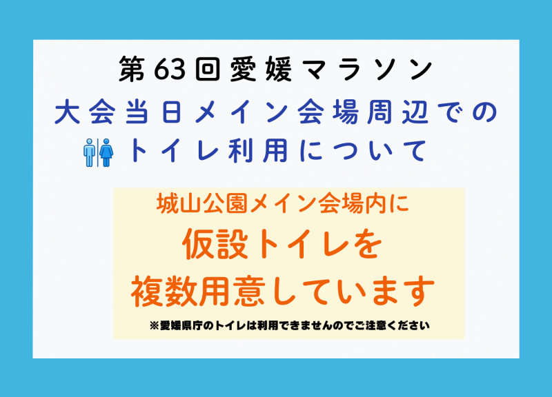 大会当日、城山公園メイン会場内には仮設トイレを複数設置しております。 【仮設トイレ設置場所】🚻 城山公園 南東エリア(さくら広場 南側) ※ 愛媛県庁のトイレはご利用いただけません。 あらかじめご了承ください。 大会当日は混雑が予想されます。 みなさまのご理解とご協力をお願いいたします。