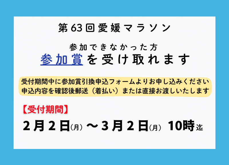 愛媛マラソンにご参加いただけなかった方で、参加賞のお受け取りをご希望の場合は